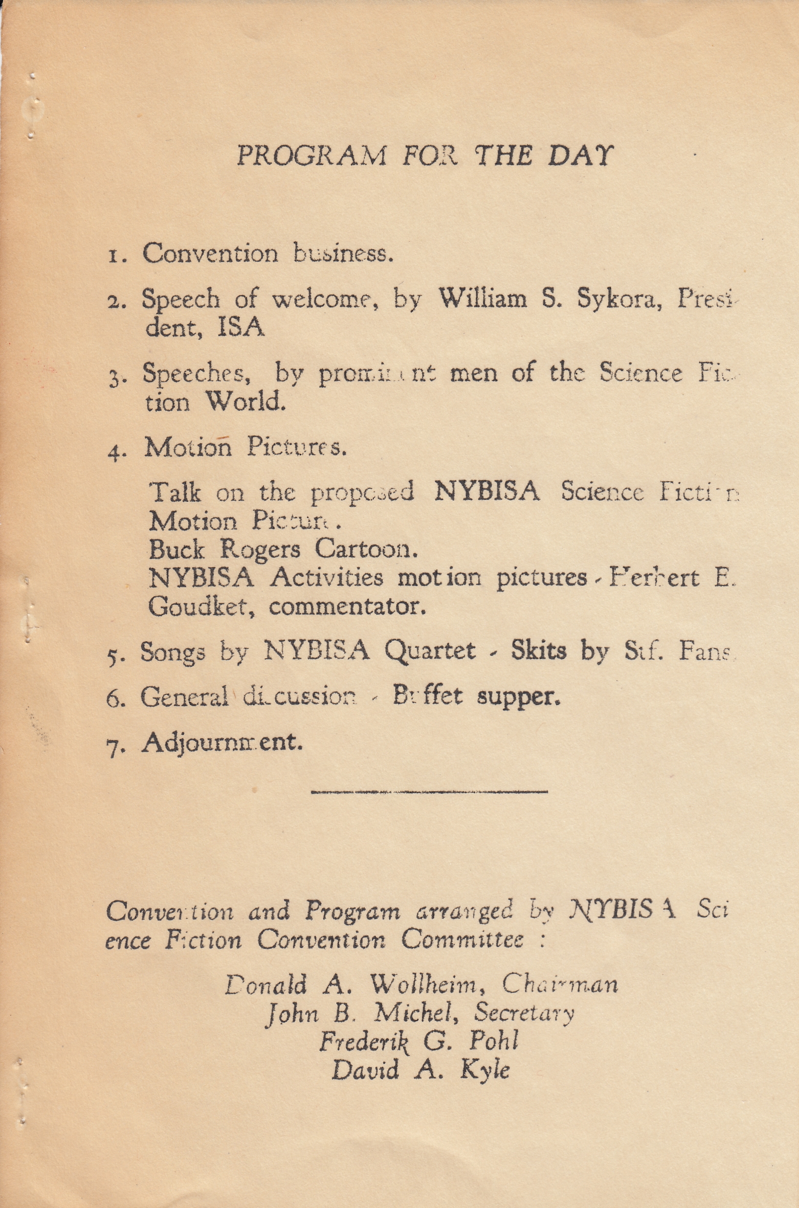 The planned New York gathering claimed the lofty “convention” moniker and was organized by the core of the New York Branch of The International Scientific Association (NYBISA). This cadre — Donald A. Wollheim, John B. Michel, David A. Kyle and Fredrik G. Pohl — would play central roles in the drama and shenanigans surrounding science fiction clubs and confabs for the next several years.